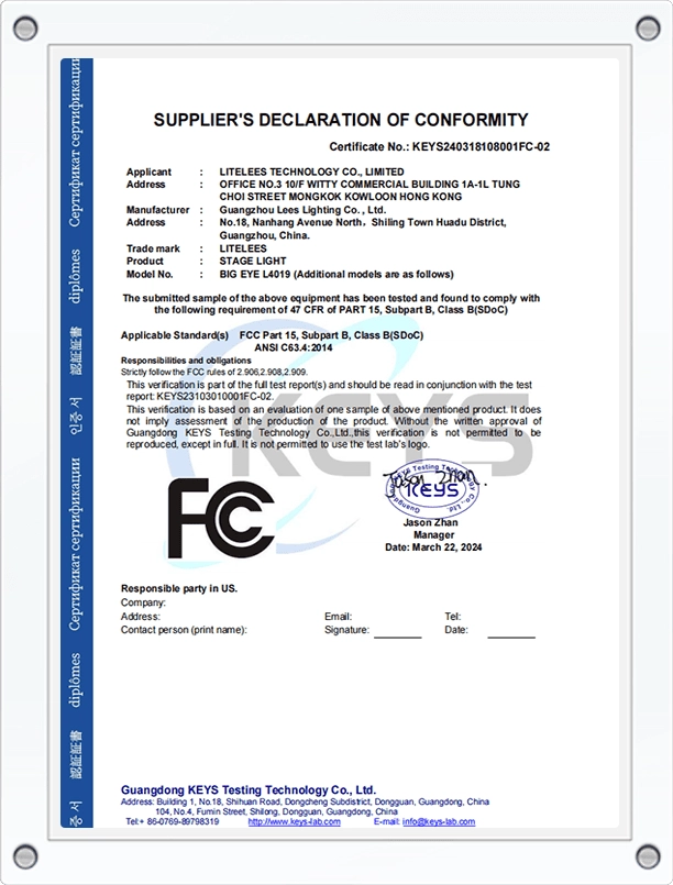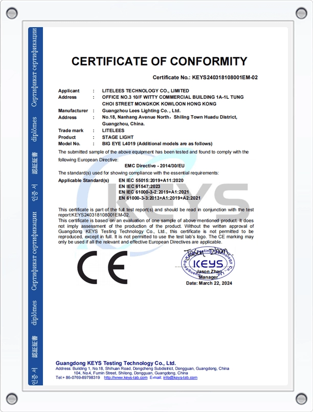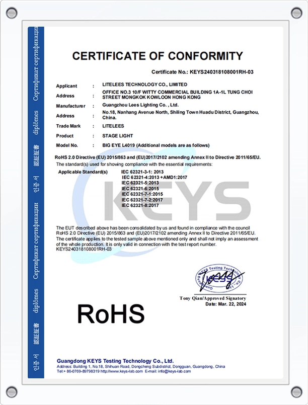 Our products meet strict international standards, certified by CE, RoHS, FCC, and BIS. The factory operates under ISO9001 quality management, ensuring every stage light delivers reliable performance and consistent quality for global markets.