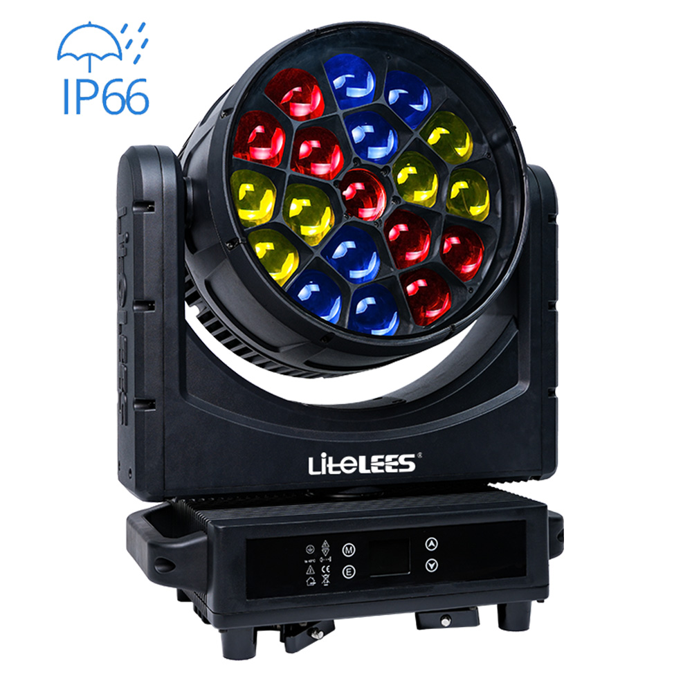 ▪ BIG EYE L4019 IP is a powerful, IP65-rated waterproof LED wash moving head light designed for both outdoor and indoor use. It's with Beam, Wash, Graphic, Dynamic Effects, and Pixel Control. Equipped with 19x40W RGBW 4-in-1 Osram LEDs, it provides vibrant color mixing and dynamic effects across a zoom range of 4° to 55°. The infinitely rotating front lens allows for stunning vortex and kaleidoscope effects.